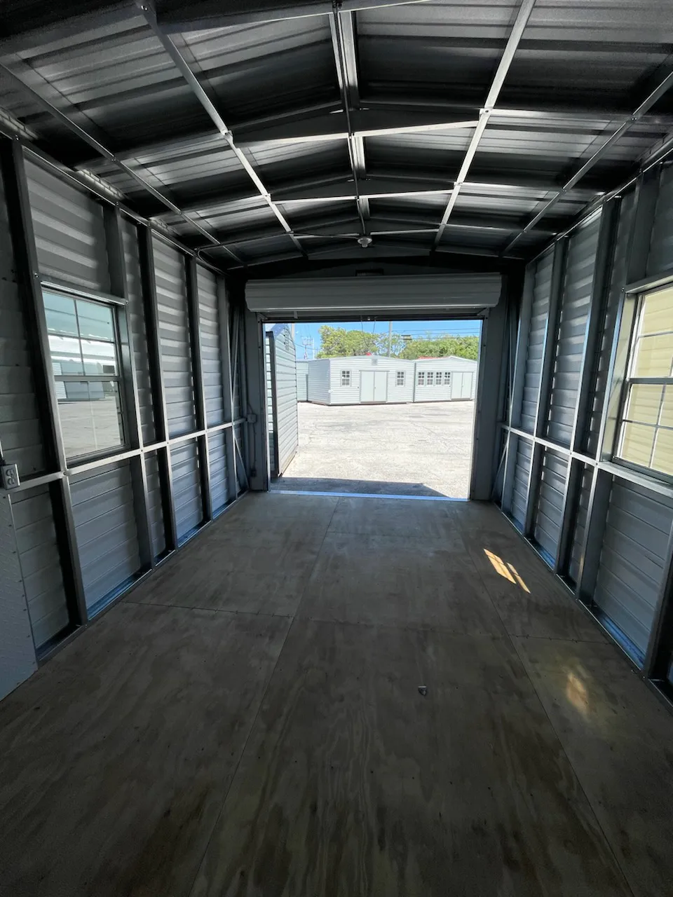 Double-Wide Portable Building by Lark Serious Space. Seamless Span. Designed with pre-engineered trusses for a full open-span interior—no posts, no interruptions, just maximum usable space. Available in sizes from 16′×16′ up to 24′×60′. Need more? Ask us about Triple-Wideoptions.
