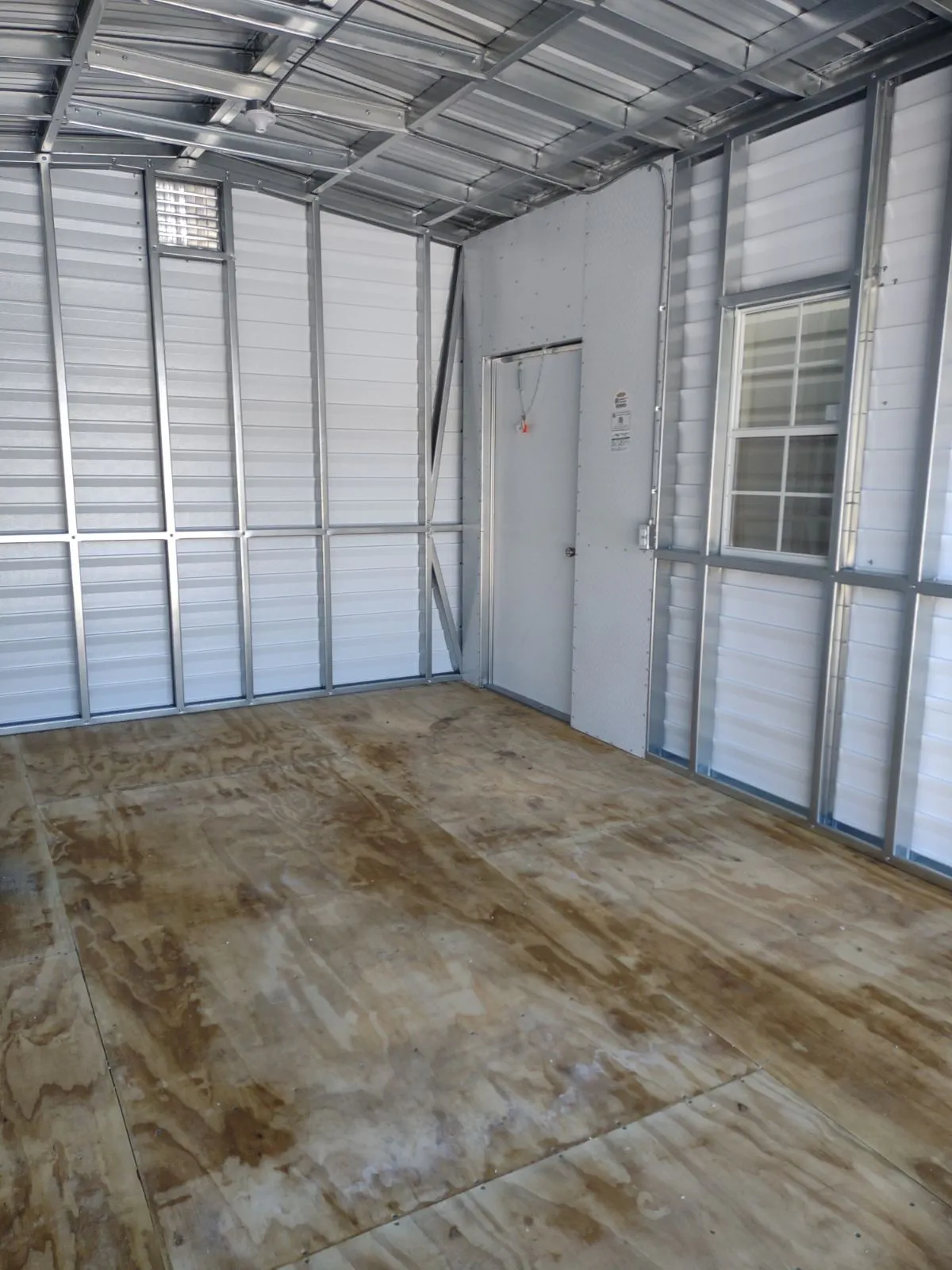 Double-Wide Portable Building by Lark Serious Space. Seamless Span. Designed with pre-engineered trusses for a full open-span interior—no posts, no interruptions, just maximum usable space. Available in sizes from 16′×16′ up to 24′×60′. Need more? Ask us about Triple-Wideoptions.