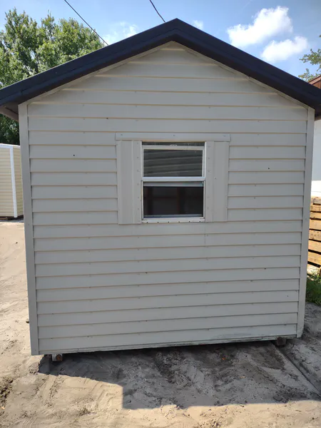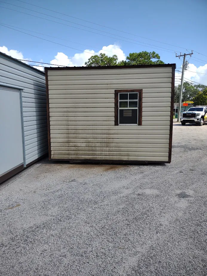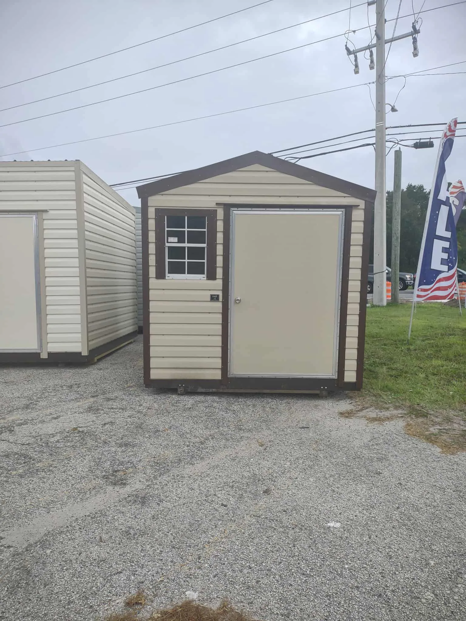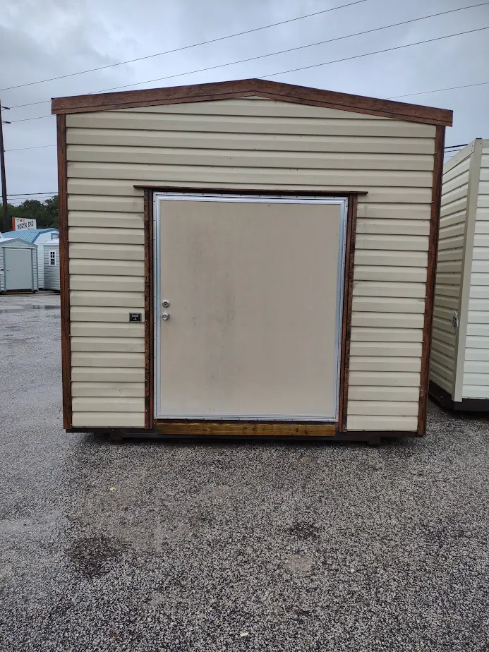 Preowned 8 x 10 Lapsider Endgable Antique Beige and Brown 1 window, 1 vent, 1 light/outlet 46 x 72 door. $2500. Stop by or give us a call today!